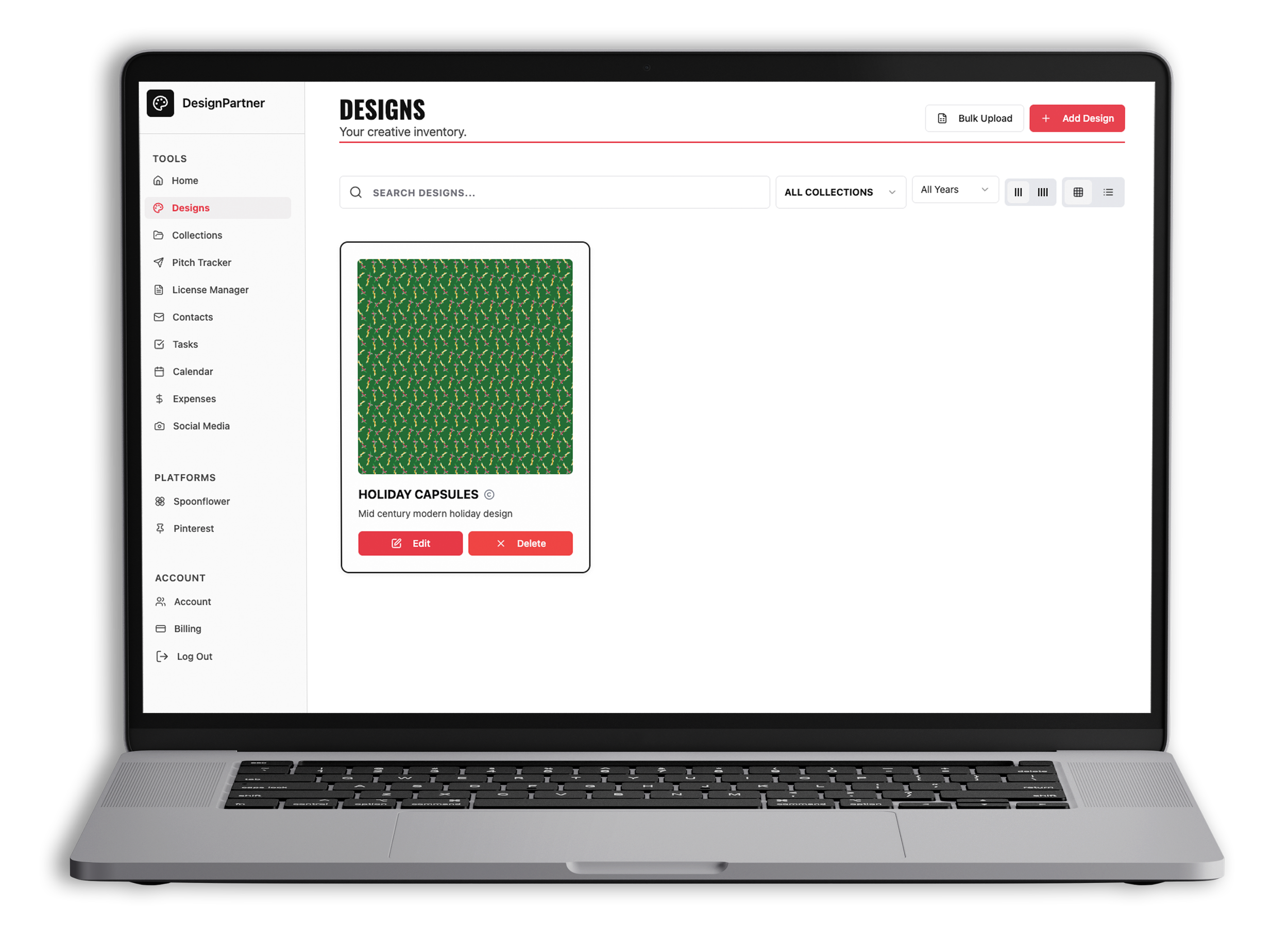 DesignPartner changes that. Unlike Airtable or Notion templates, this is a purpose-built platform for licensing artists. Your designs, collections, pitches, contacts, and licenses finally live in one place. It’s not just organization. It’s momentum.