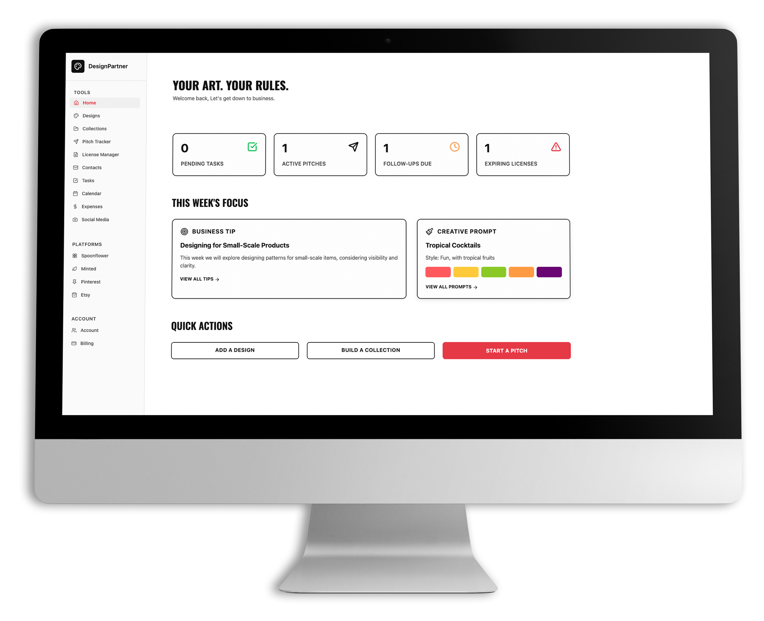Because staying organized is only part of the journey, DesignPartner also keeps you inspired, informed, and ahead of the curve. With weekly art prompts and actionable business tips plus monthly curated trend insights, you’ll always know what to create, how to pitch it, and when to put it out into the world.