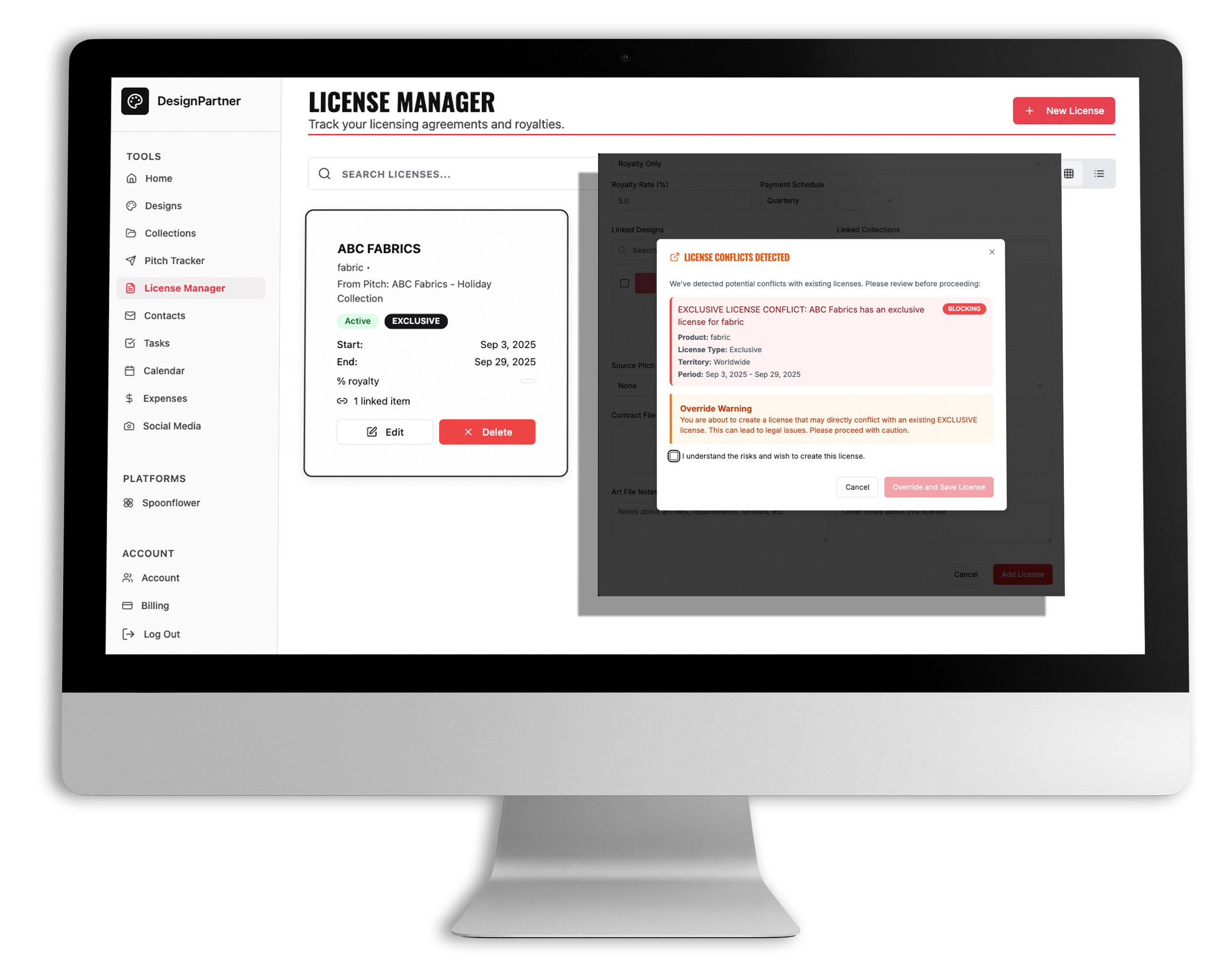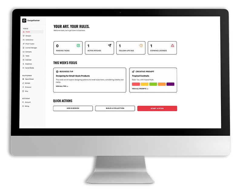 Track licenses, manage royalties, and see your work out in the world. DesignPartner isn’t just about managing—it’s about helping you build the creative career you’ve been dreaming of.
