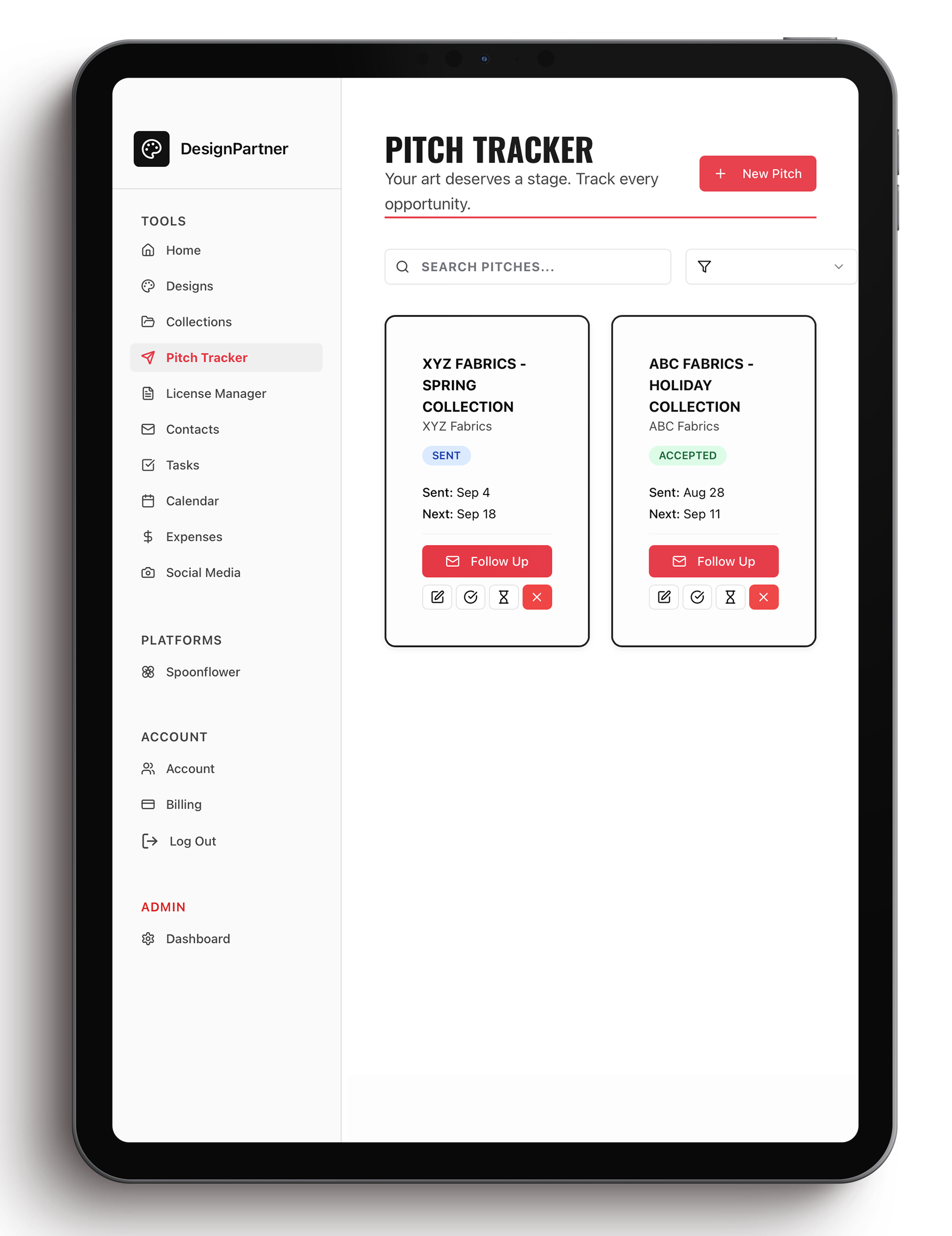 Send your portfolio page, track your submissions, and never miss a follow-up. From the first email to the signed license, DesignPartner keeps your career moving forward.